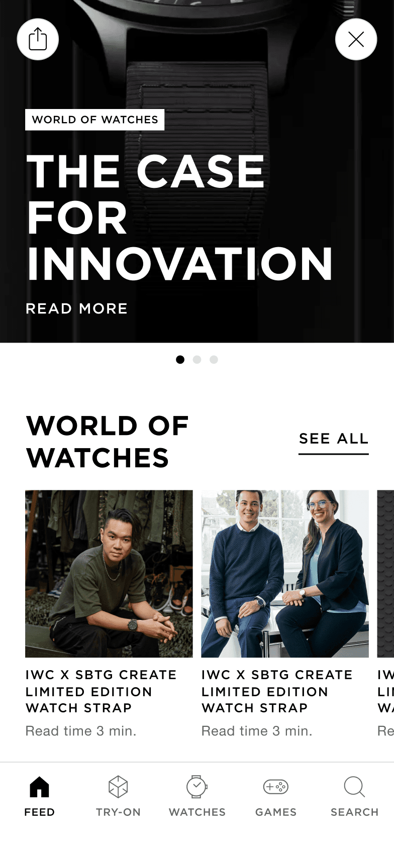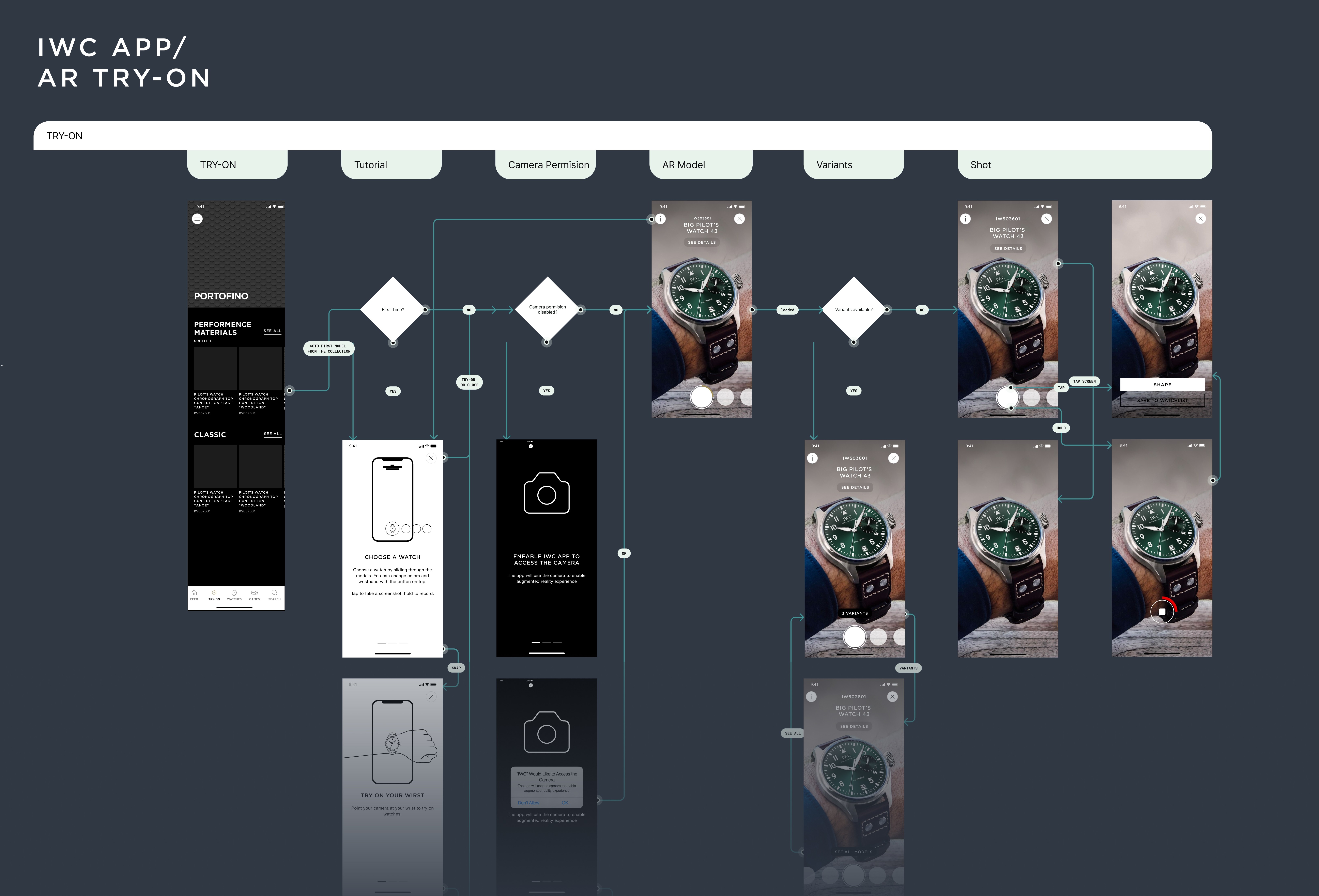 As lead UX, I structured the IWC app across home, watch, campaign, and content flows. I redesigned AR try-on to feed into shopping, built templates for launches like Top Gun and Ingenieur, and added an integrated boutique locator.